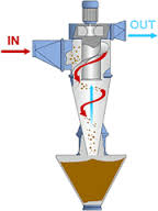 當(dāng)含塵氣流由進(jìn)氣管進(jìn)入旋風(fēng)分離器時(shí),氣流將由直線運(yùn)動(dòng)變?yōu)閳A周運(yùn)動(dòng)。旋轉(zhuǎn)氣流的絕大部分沿器壁自圓筒呈螺旋形向下沿錐體流動(dòng)。含塵氣體在旋轉(zhuǎn)過(guò)程中產(chǎn)生離心力,將重度大于氣體的塵粒甩向器壁,沿壁面下落到底部卸料閥排出,將塵粒從氣體中分離出來(lái)的一種氣固分離裝置。
